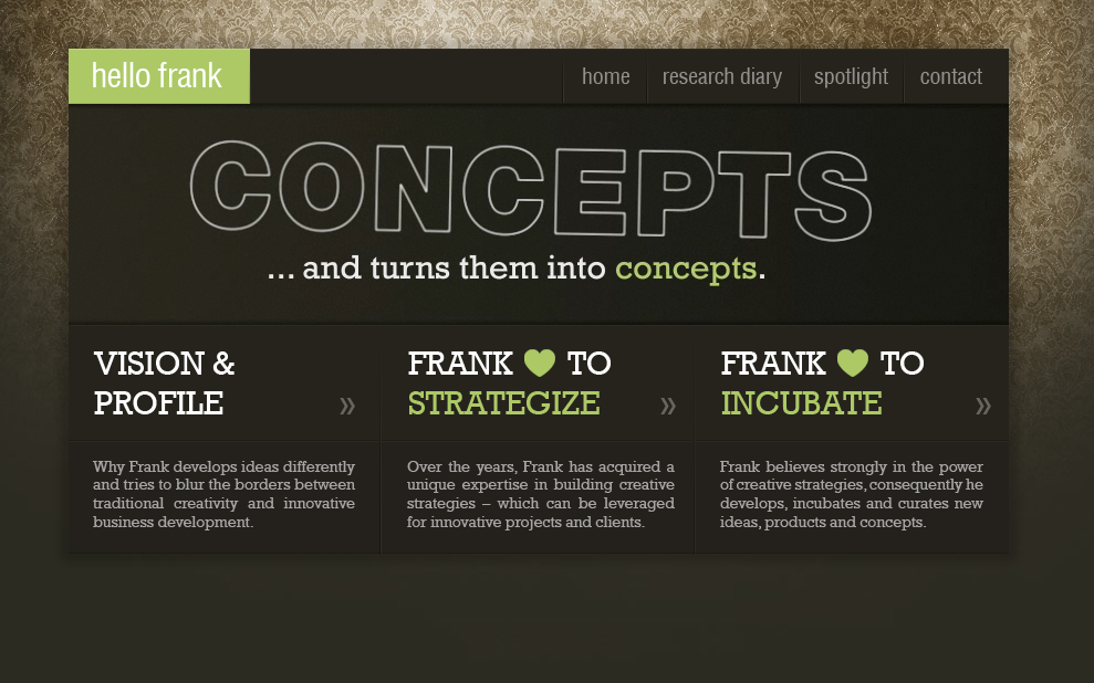 Zo kwam ik terecht bij Frank Bongers. Frank takes creative ideas and turns them into concepts. Uitgerekend het soort ouderwetse reclame dat schreeuwt vanop een auto maakt publiciteit voor een interessante kerel met visie. Check out for yourself.
